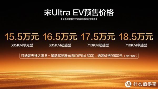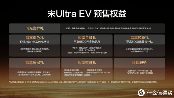 此次预售的宋Ultra EV共推出四款配置车型,分别为605KM领先型、605KM超越型、710KM超越型、710KM卓越型,部分款型还可花9900元选装天神之眼B-辅助驾驶激光版(DiPilot300),满足不同消费者的用车需求。而在预售权益上,比亚迪的诚意拉满,非营运车主自交车之日起可享18个月比亚迪闪充充电桩免费充电,还能免费获得价值3000元的烟岚紫或棕榈绿个性车色;金融方面支持最低0首付、至高5年超长贷,还有8万24期0息、首付50%尾款50%至低1年0利息0月供等多种方案,至高可享6600元金融贴息;置换补贴上,本品置换至高5000元,他品置换至高4000元。同时,新车还为车主提供非营运车辆三电系统终身保修(首任车主)、整车6年或15万公里包修等质保权益,以及终身免费基础流量、OTA升级等智联福利,多重礼遇覆盖购车、用车全周期。
