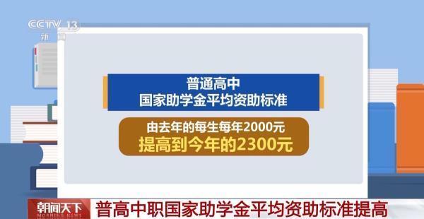 此外,普通高中国家助学金平均资助标准,由去年的每生每年2000元提高到今年的2300元;中等职业学校(含技工院校)国家助学金平均资助标准由去年的每生每年2000元提高到今年的2300元。