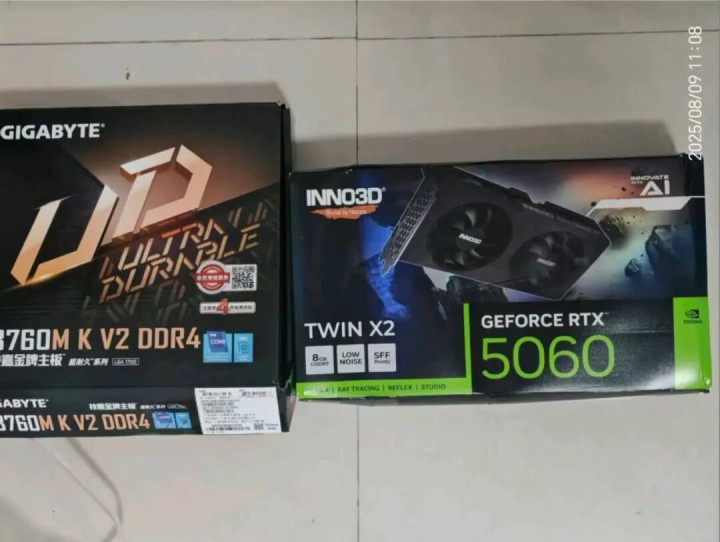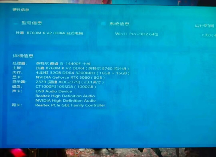这机器配了技嘉B760MK DDR4 V2主板、英特尔酷睿i5-14400F处理器、映众RTX 5060 8G独立显卡、七彩虹32G DDR4 3200MHz内存(2根16G)、英睿达1TB PCle 4.0 M.2固态硬盘以及鑫谷650W白牌电源。我大致拆算了一下成本,这价格自己攒不出来,除非是二手配件。