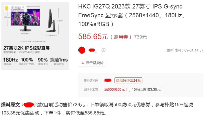当然还缺一部显示器,我随手找了一台HKC IG27Q,这是27寸高分高刷显示器,分辨率2560x1440,刷新率180Hz,狗东活动价739元,国补后是585.64元。