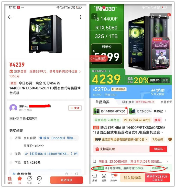 下午我在张大妈扒拉了一圈,找到了这个映众幻刃456台式机,狗东原价5270元,使用国补后直接是4239元。我看有8个地区支持国补,分别是四川、云南、贵州、陕西、陕西、辽宁、福建和天津,范围不算小。